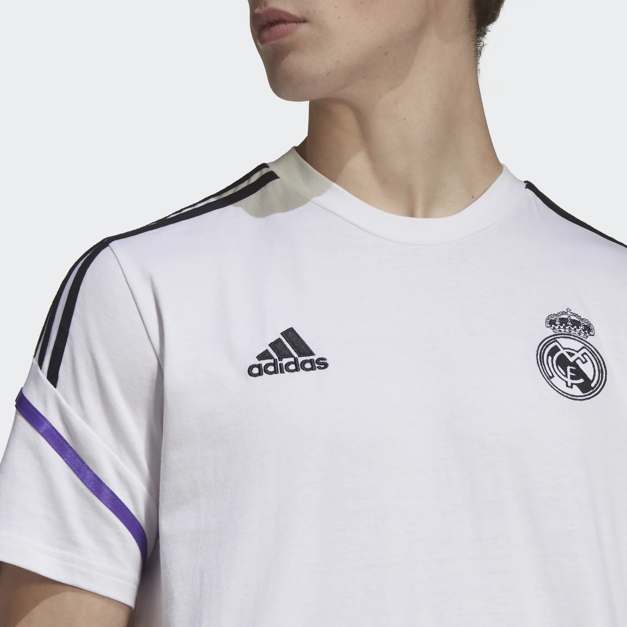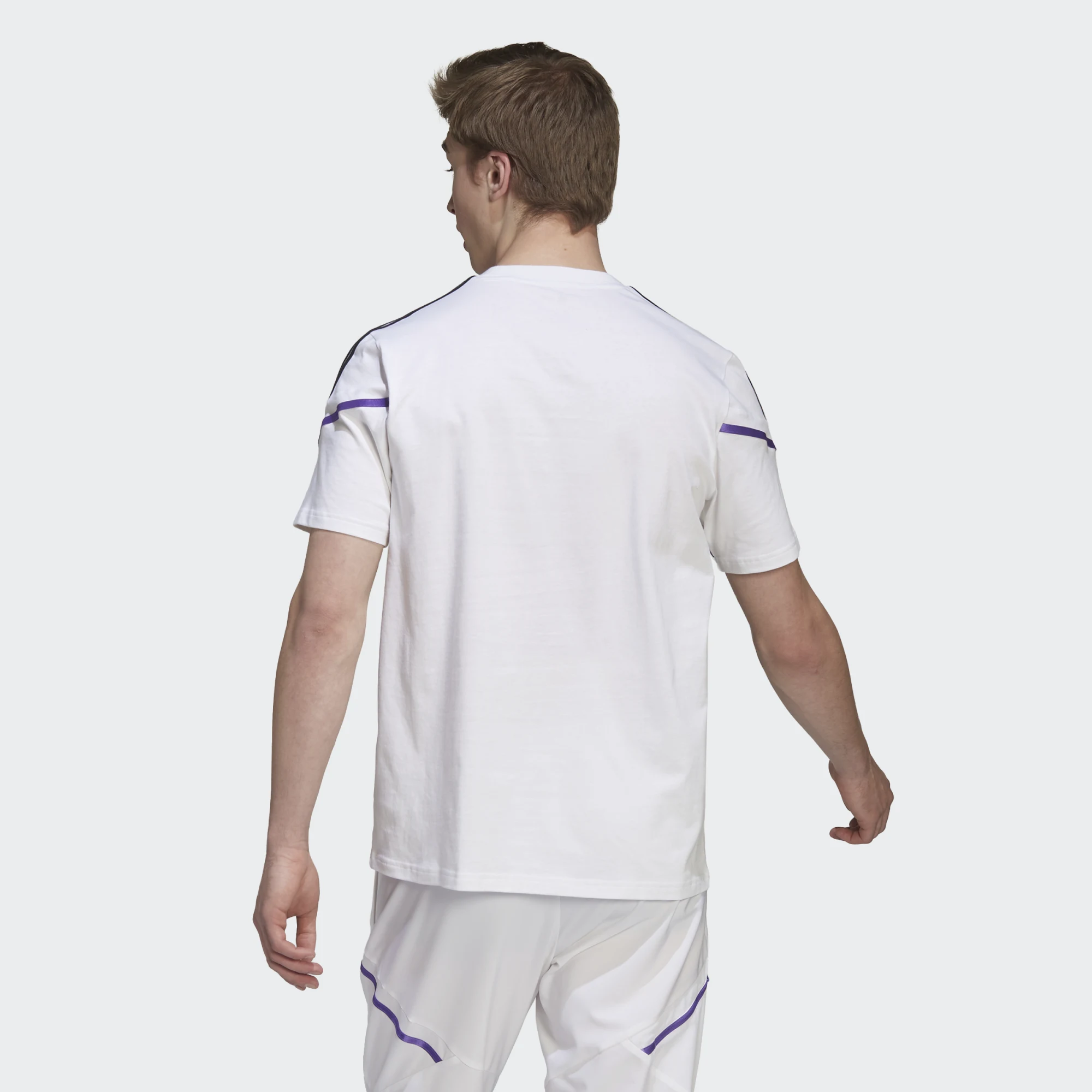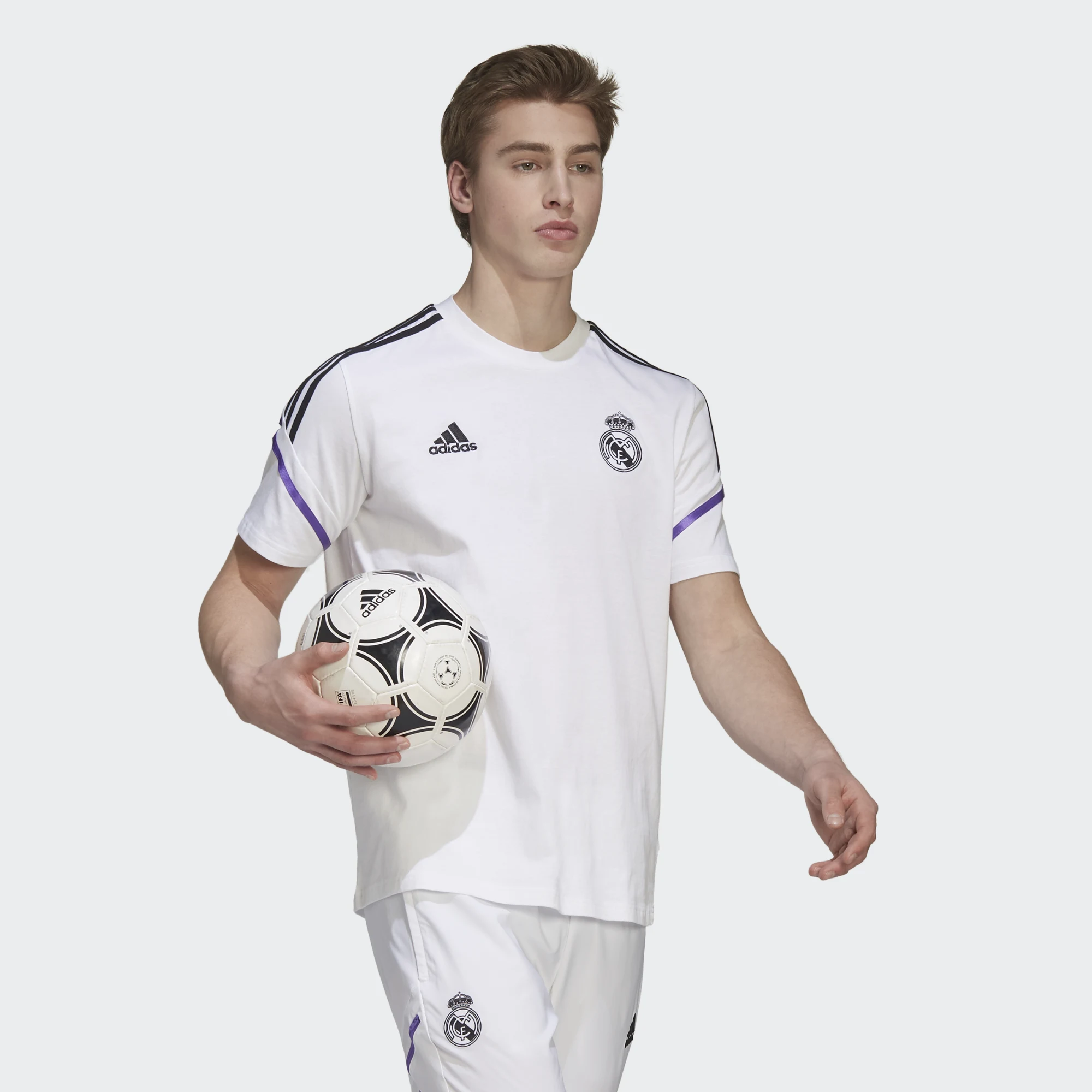 Le vrai travail se fait toujours loin du terrain du Bernabéu. Quand les joueurs du Real Madrid ont besoin de confort entre deux sessions d'entraînement intenses, ils portent ce t-shirt d'entraînement de football adidas. Ce modèle est conçu en jersey doux pour un look casual et décontracté quand tu es en mode récupération.