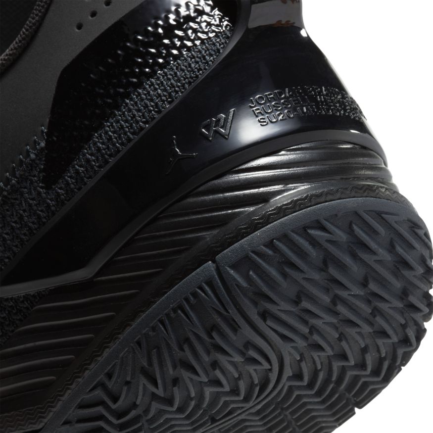 La semelle extérieure en caoutchouc est divisée en deux sections séparées par une pièce rigide alliant structure et maintien. Le motif d’adhérence à chevrons modifié est inspiré de la AJ29, l’une des chaussures préférées de Russ.