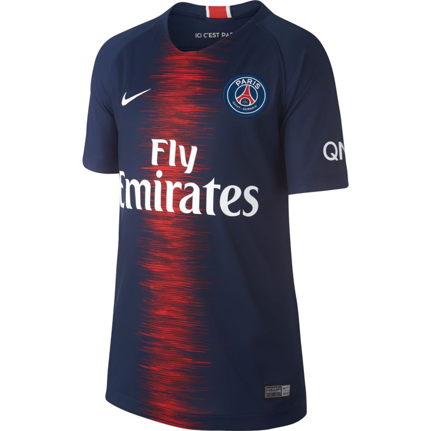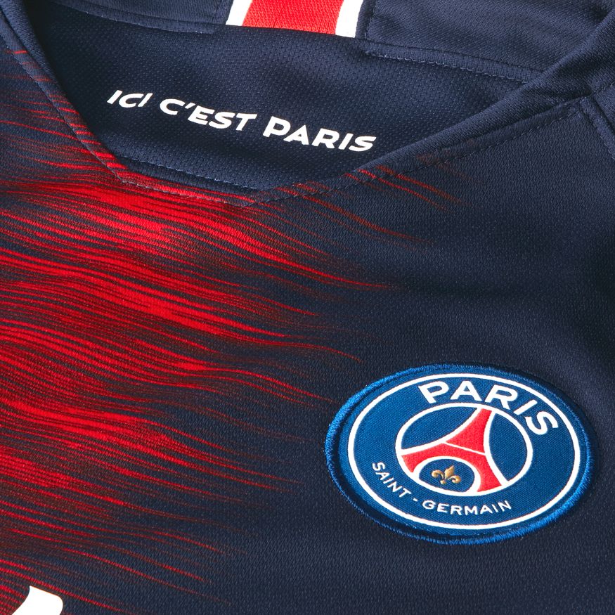 Nouveau maillot du PSG 2018/2019 avec la traditionnelle bande rouge au milieu.