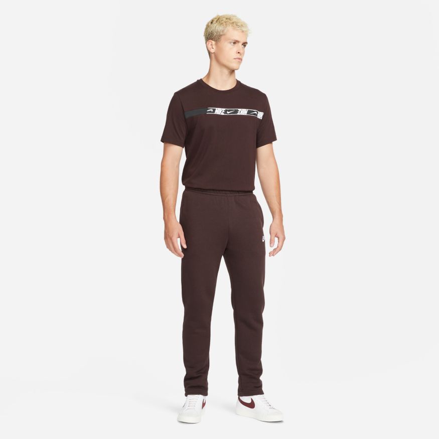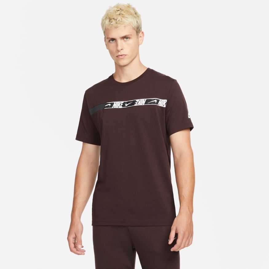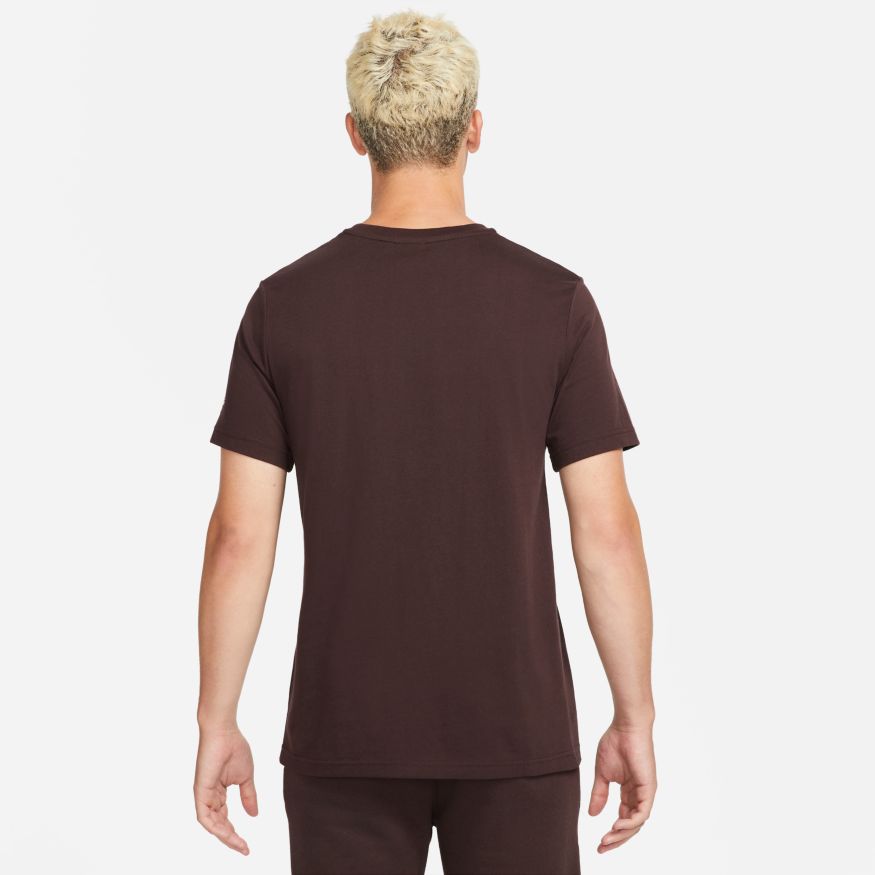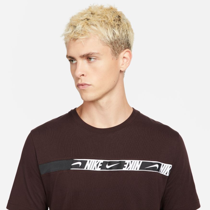 Représentez votre fidélité au Swoosh où que vous alliez avec le t-shirt Nike Sportswear. Il est fait de coton doux pour vous draper confortablement, tandis qu'une bande de logos répétés traverse votre poitrine. Ce produit est composé d'au moins 75 % de fibres de coton biologique.