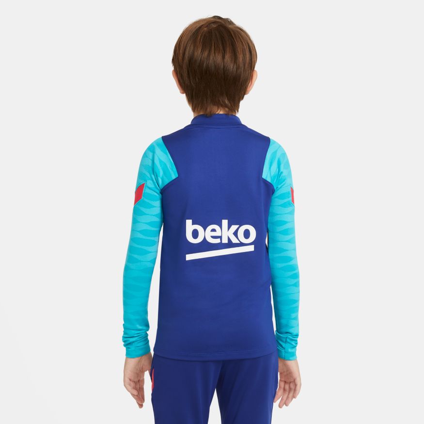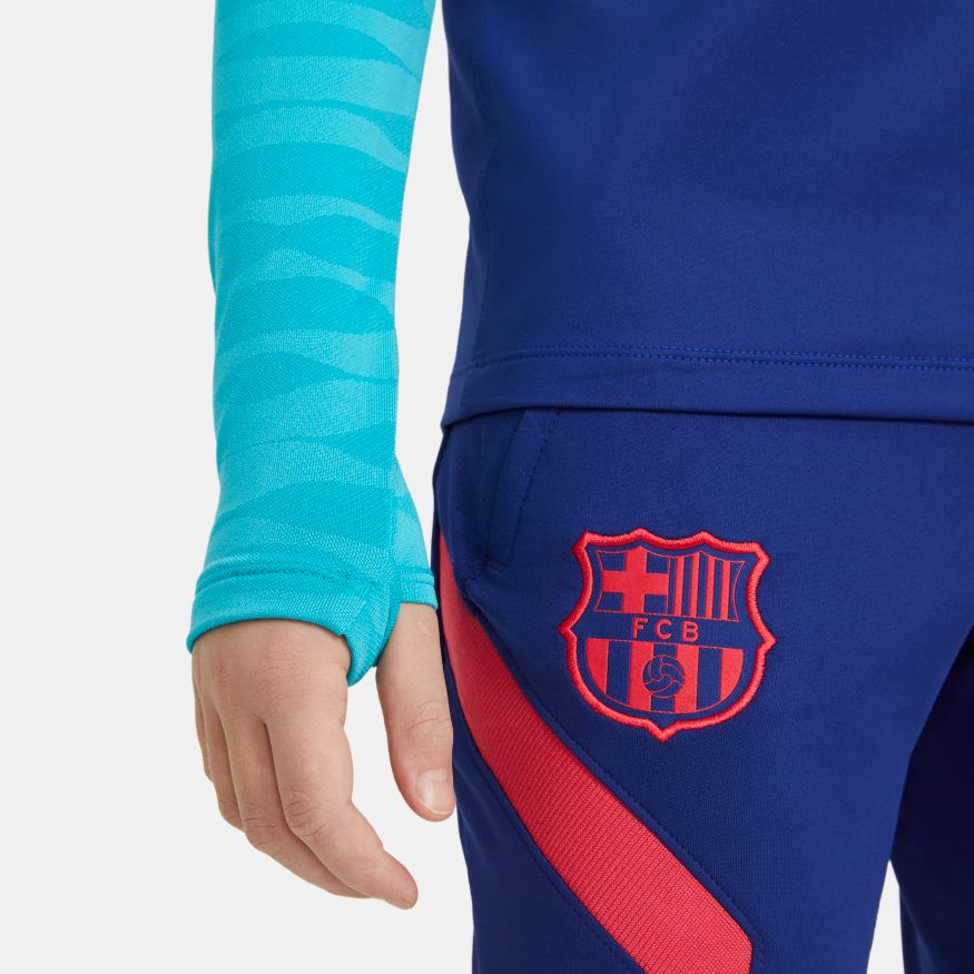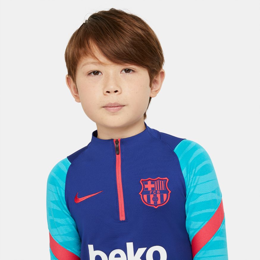 Le haut d'entraînement FC Barcelona Strike présente une coupe ajustée et des ouvertures dissimulées pour les pouces qui permettront à votre enfant de rester concentré durant l'entraînement. Le tissu anti-transpiration est particulièrement efficace lorsque le match s’intensifie.