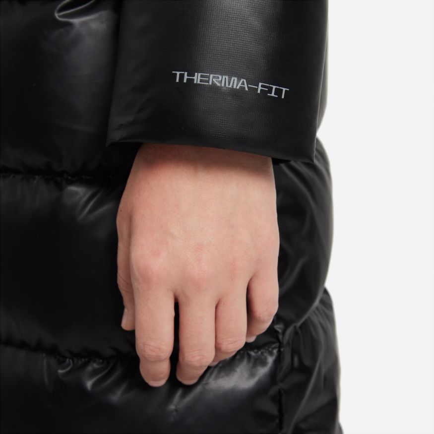 La parka Nike Sportswear Therma-FIT City Series modernise une pièce incontournable par temps froid. L'isolation en duvet offre plus de chaleur de la capuche jusqu'à l'ourlet, qui arrive à mi-mollets. Les détails signature Nike se présentent sous la forme d'un motif Futura sur la poitrine et d'une boucle au niveau de la nuque pour pouvoir l'accrocher à une patère.